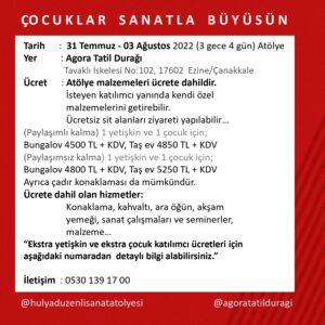 Çanakkale, Ezine, Tavaklı, Bozcaada’nın karşısında Güzel Ege sahilinde Agora Tatil Durağı’nda Çocuk Yaz Atölyesi