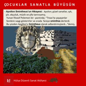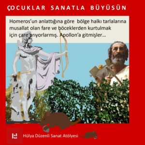 MÖ 8. yüzyıl sonlarında yaşadığı sanılan şair Homeros’un İlyada adlı kitabında anlattığına göre bölge halkı tarlalarına musallat olan fare ve böceklerden kurtulmak için çare arıyorlarmış. Apollon’a gitmişler… Apollon; güzel sanatlar, ışık, şiir, okçuluk, müzik ve şifa tanrısı olan Apollon’dan yardım istemişler. Yunan filozof Polemon bir yazıtında; “Troas’ta yaşayanlar farelere saygı gösterirler ve orada fareye sminthos derlerdi. Bu yüzden Apollon’u Smintheus olarak adlandırmışlardı…”diyor.
