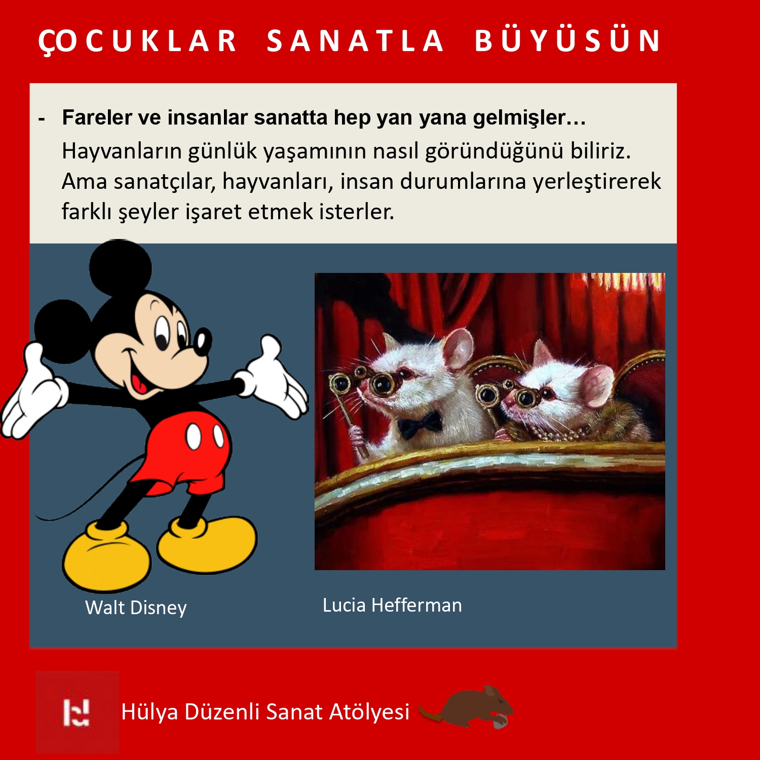 Eğitmen Hakkında: Bu çalışmalara 1980 yılında Mimar Sinan Güzel Sanatlar Üniversitesi, Güzel Sanatlar Fakültesi, Resim Ana Sanat Dalı yüksek mezunu olan ben Hülya Düzenli başkanlık edeceğim. Şimdiye kadar özel bir kurumda ve çeşitli üniversitelerde, resim dersleri verdim, kişisel sergiler açtım, sanat yaşamımı sürdürdüm… Dünya Müzelerinin pek çoğunda canlı olarak anlatımlar yaptım. Halen Hülya Düzenli Sanat Atölyesi’nde online Sanat Tarihi, Resim, Konsept Yönetimi ve Temel Sanat Eğitimi dersleri vermekteyim.