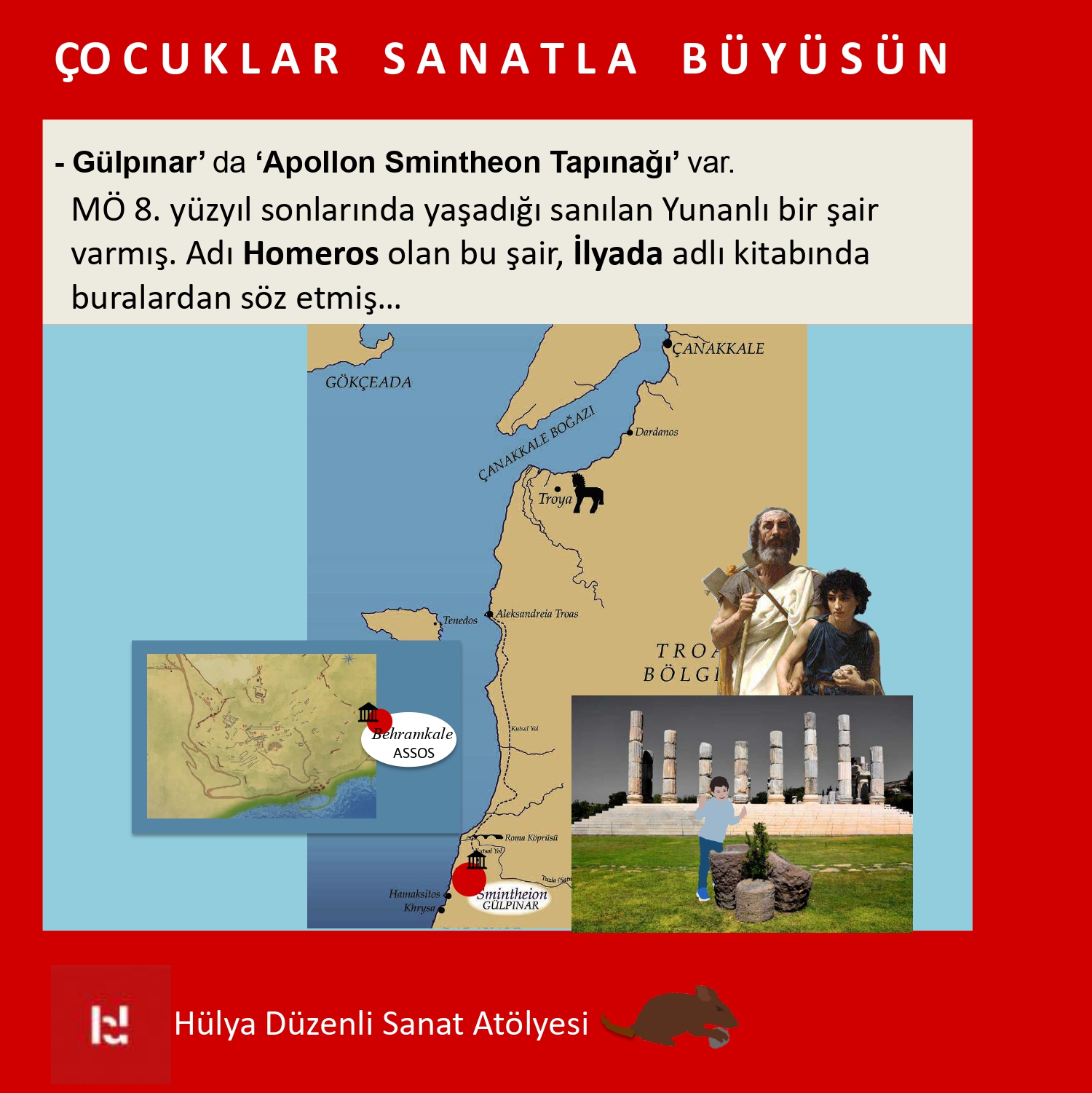 Eğitim Hakkında: ‘ÇOCUKLAR SANATLA BÜYÜSÜN’ başlıklı buluşmamızda, deniz kenarında koruluk bir alanda iki önemli ören yeri olan Assos da bulunan Athena Tapınağı ve Gülpınar’da bulunan Apollon Smintheion’a yakınız. Buralar hakkında tanıtımlar yapacak, bölgenin sanatsal ve tarihsel kimliğine bakacağız.